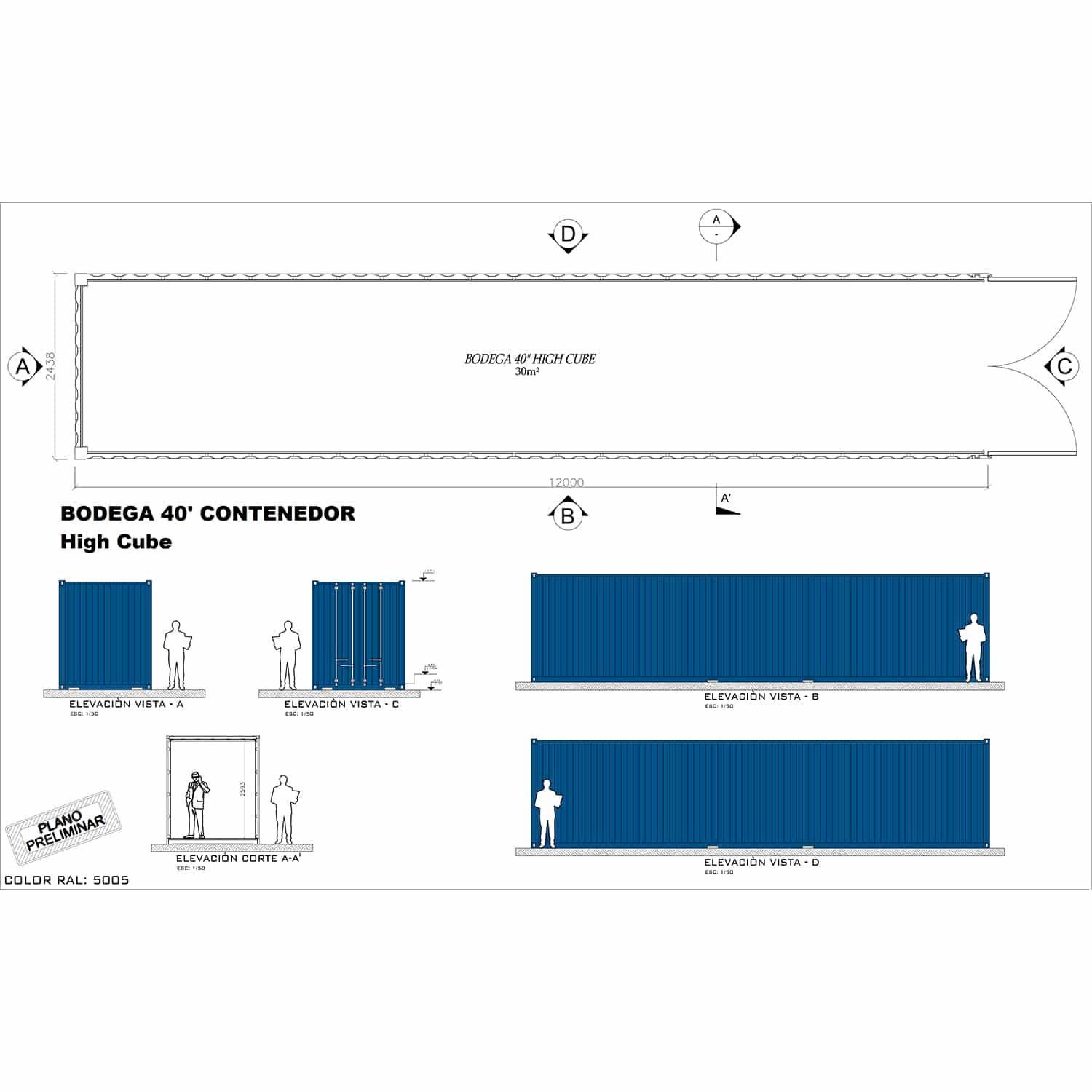 Bodega desarrollada en base a contenedor marítimo original de 40 pies de alto High Cube, posee una estructura en base a perfiles de acero, según normativa ISO-668, unido mediante soldadura MIG, muros de planchas plegadas de acero corten de 2,3 [mm] con la pintura original del contenedor.