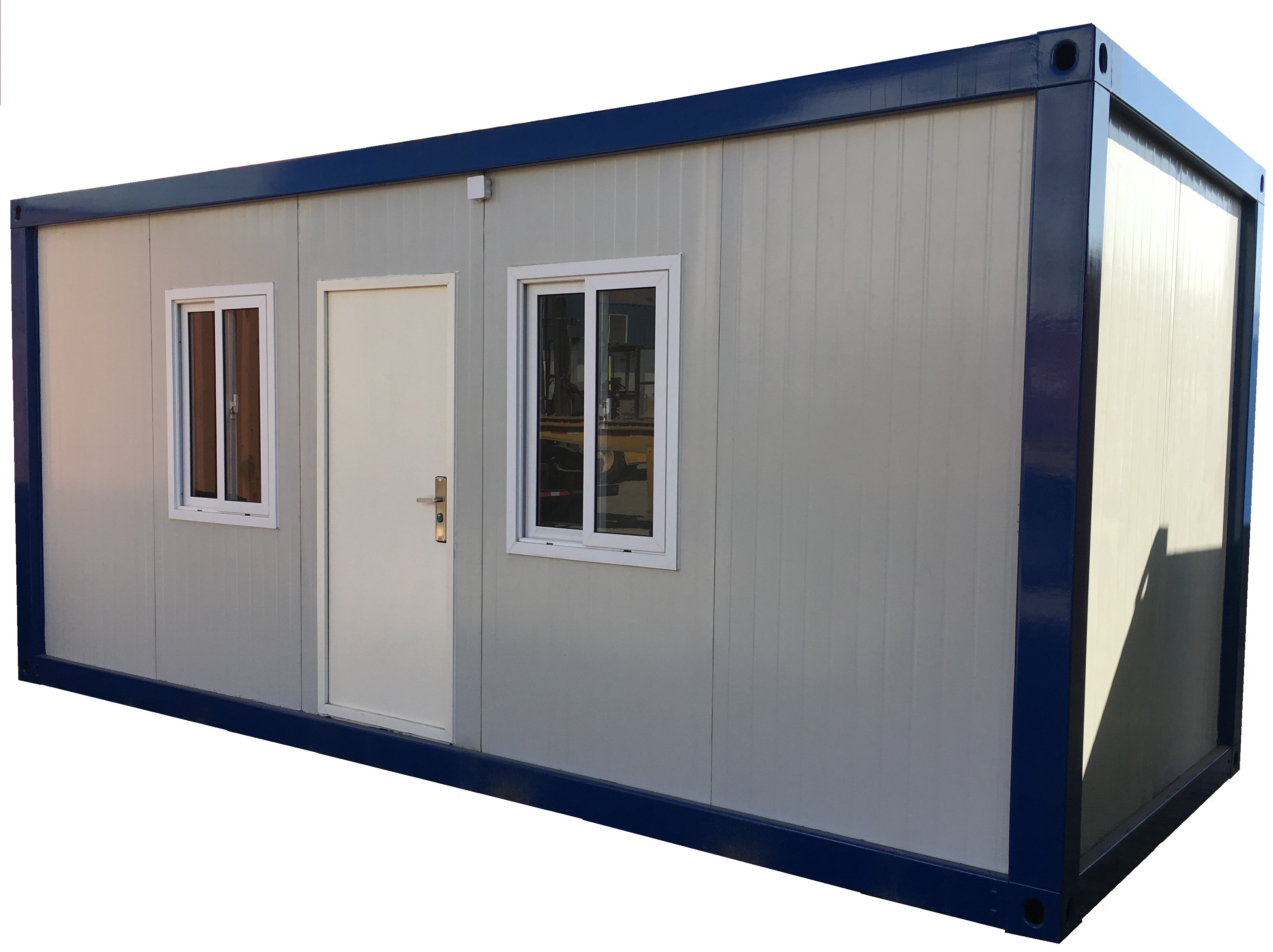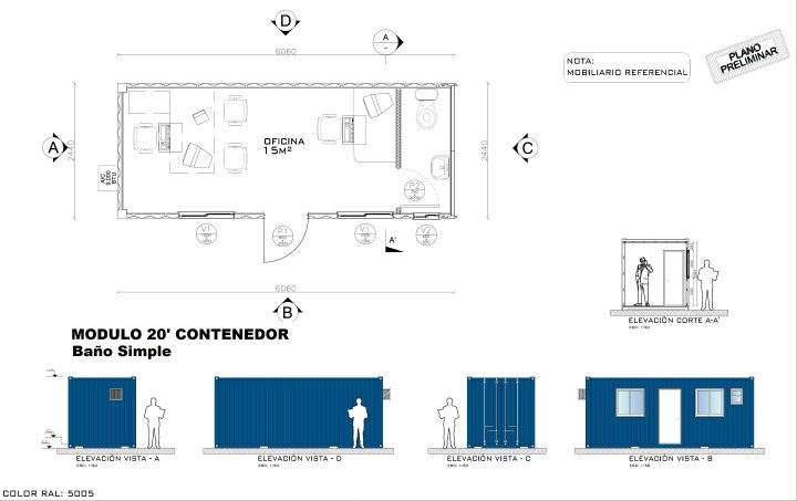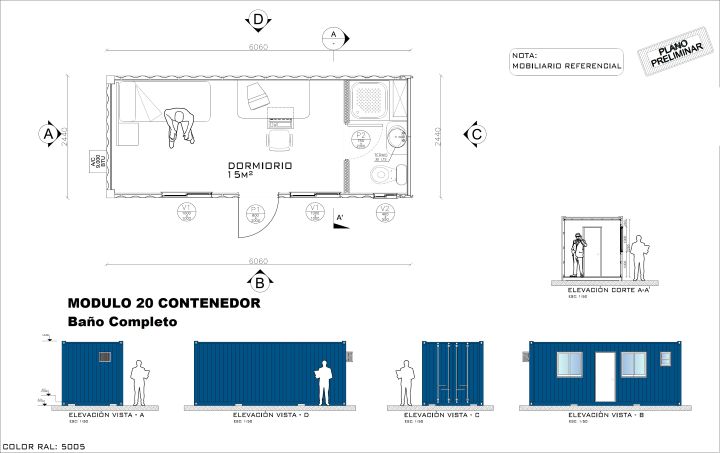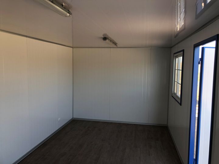 Espacio desarrollado a partir de contenedor marítimo de 20 pies, el cual es modificado para darle características de habitabilidad como son ventanas de 100×100 [cm], puerta de acceso del mismo material del contenedor, además posee incorporada la instalación eléctrica en base a cables THHL considerando automático, luminarias, interruptor y enchufes además de una caja exterior para su empalme a la red eléctrica local.